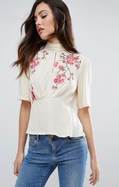 3) ASOS Tea Blouse With Embroidery, $74: Staying true to spring’s florals, this off-white blouse makes a splash with its delicate pink embroidered blossoms. The high collar, subtle keyhole neckline and slight pleats help to pull the style together.
