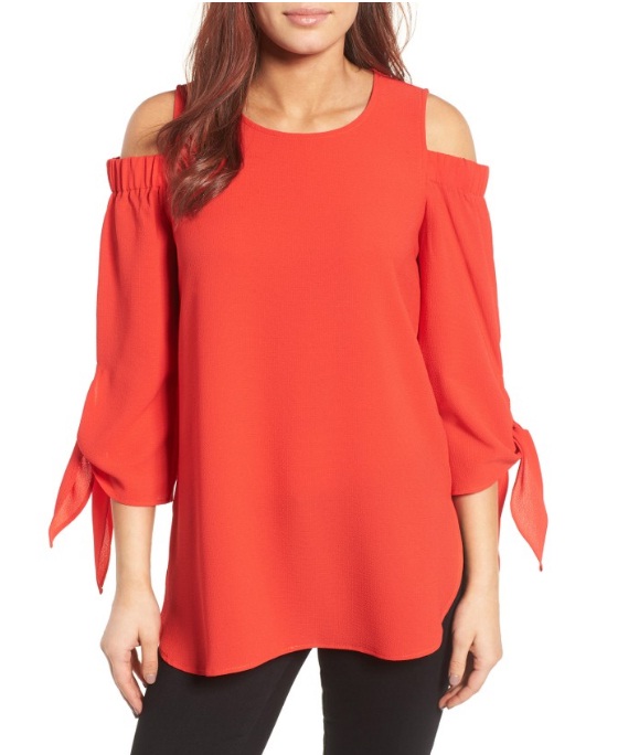 4) Gibson Cold Shoulder Top, $85: With cold shoulder styles enjoying a moment in the sun, your toned upper arms can also embrace the spotlight. This vivid orange red blouse features loosely tied sleeves, cut-out shoulders and a loose hem.