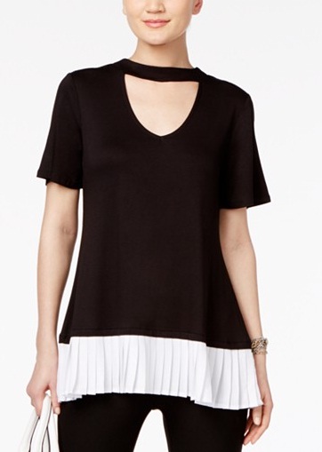 1) Cable & Gauge Keyhole Pleated Blouse, $50: Along with bringing the attention to the shoulders, Spring 2017’s runway trends also feature the choker neckline. This short-sleeved black chiffon blouse is detailed with a white chiffon pleated hem, for a contrasting effect.