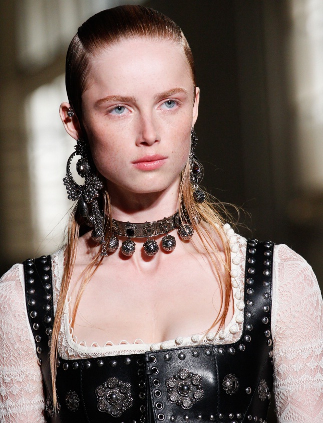 At Cavalli, the choker was a bedecked and vaguely exotic sight, complete with all manner of glittering ornaments. The look of bright primary shades of yellow, red and blue offered a vibrant rainbow effect. Meanwhile, tiny floral accents and gleaming silver completed the design. For a truly bohemian chic look, turn to an embroidered pashmina scarf to contrast against your bold necklace.