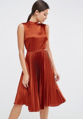 2) ASOS Sleeveless Pleated Midi Dress in Satin with High Neck, $65: With its ladylike high neckline and delicate pleated skirt, this deep tan frock is a beautiful piece. Meanwhile, the satin fabric and mid-length hem help to lend a girlish, floaty finish.