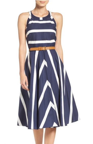 5) Eliza J Stripe Fit & Flare Dress, $222: You may be in a crowded auditorium as opposed to on a boat, but navy blue and white stripes can easily transform you into a stylish graduate. This mid-length number is detailed with horizontal and diagonal stripes, while the halter neckline and camel-coloured belt complete the overall look.