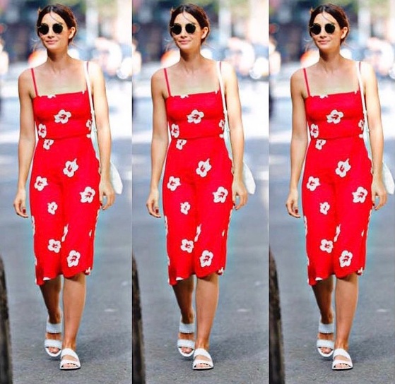 The gorgeous model may stun on the Victoria’s Secret runway, but she looks just as fashionable strutting the sidewalks. If you need any evidence, just glance at this bright red spaghetti strap dress. With its punchy white floral print, the frock certainly lights up the streets of New York City. Meanwhile, a straight neckline and knee-length hem keeps the overall look ladylike and modest. Proving that minimalist accessories can be perfect, Aldridge styles her ensemble with aviator sunglasses and flat white sandals.