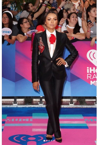 While many opted for feminine frocks, 27-year-old All Eyez on Me star Kat Graham stunned in a gorgeous pantsuit. The beautiful actress stepped out in a sleek dark blazer adorned with contrasting red embellishment and paired with matching trousers. Her white lace blouse, red knotted tie and classic black pumps helped to bring her suit statement to life.