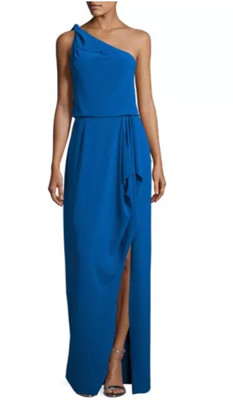 3) Halston Heritage One-Shoulder Stretch Crepe Evening Gown, $225: The punchy lapis colour of this Halson Heritage gown makes it an eye-catching look for your next special occasion. Meanwhile, the single shoulder, elongating style and draping on one side all help to create a chic effect.