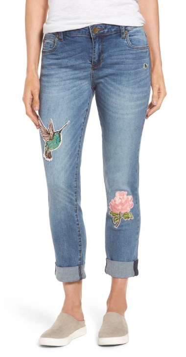 3) KUT FROM THE KLOTH Appliquéd Boyfriend Jeans, $121: As stylesetters embrace the uprising of embroidered denim, the hummingbird and floral appliqués on these jeans fit the bill. We are also liking the light wash and loose boyfriend fit, which are a comfortable change from the indigo skinnies of the city streets.