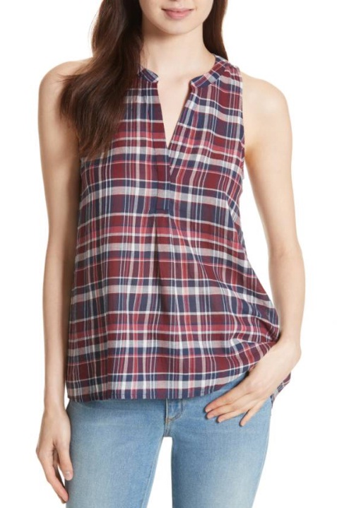 5) Joie Aruna Plaid Top, $228: If you usually think of bulky lumberjacks when you see plaid, this pretty sleeveless blouse just may change your mind. With its red and blue checkered pattern, the top can easily fit into the casual atmosphere of a campground. Meanwhile, the dainty pleats and subtle V-neckline bring a ladylike, tailored touch to a simple cotton piece.