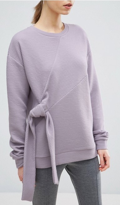 1) ASOS Sweatshirt with Knot Detail, $26: Far removed from its origins as a couch potato mainstay, the sweatshirt has been revamped as a stylish wardrobe pick. As temperatures up north and in the countryside often dip, a cozy knit can keep you warm once the sun sets. This loose, lilac-coloured sweatshirt features a round neckline and a knotted tie on one side.