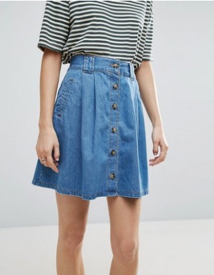 2) Asos Denim Button Front Mini Skater Skirt In Mid Wash Blue, $35: With its high-rise cut, light blue colour and flared design, this denim skirt is ideal for a low key Saturday ensemble. Try pairing this piece with a crop top, or a strappy silk camisole for an evening outfit.