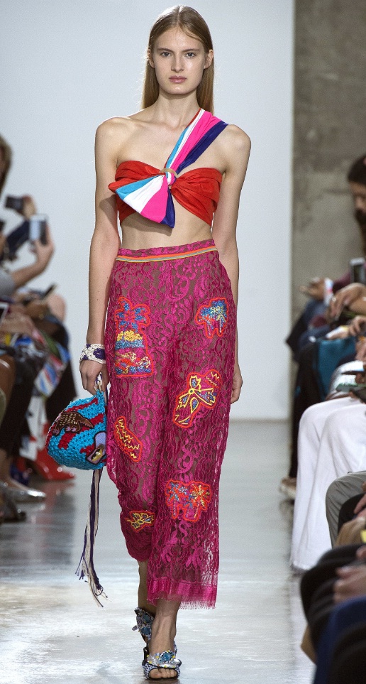 For a fun and beach-ready take on the trend, look no further than the Peter Pilotto catwalk. The runway transformed the bralette into a casual staple, with a multicoloured diagonal bow and a crimson-coloured bandeau top. Meanwhile, airy magenta lace trousers make a splash with colourful embroidered patches.