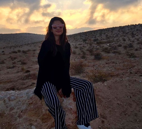 The 25-year-old Portuguese stunner looks effortlessly stylish in these flared black and white pinstriped trousers and a loose dark knit top. With an emphasis on comfort, Sampaio’s look is perfect for a travel adventure where plenty of walking is in store. For a finishing touch, her funky frames bring visual interest to an otherwise perfectly understated ensemble.