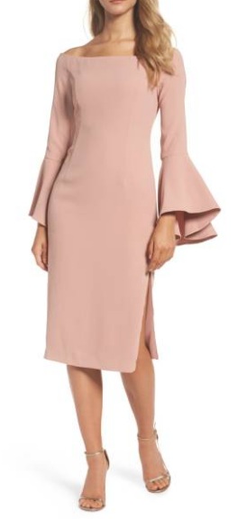 3) Bardot ‘Solange’ Off the Shoulder Midi Dress, $157: The soft pale pink colour of this mid-length frock makes it a gorgeous look for a business function or a party. Of course, the fluttery sleeves and slit up the leg lend visual interest and create a chic effect.