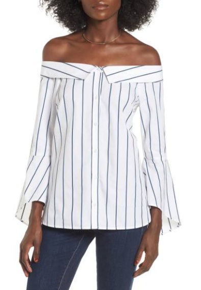 1) Leith Portrait Collar Stripe Blouse, $78: With its off-the-shoulder neckline, this black and white pinstriped blouse is sure to fit into your work and weekend wardrobes. The elongating stripes can instantly make you appear leaner and slimmer, while the long bell sleeves are on trend for the season ahead.