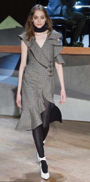 If you want to make the checkered trend feel feminine and dainty, turn to the Self-Portrait runway. The look of a grey plaid ruffled frock can easily transform checks from stuffy and staid to contemporary. A finishing V-neckline, thigh-high slit and ruffled hemline can instantly create a ladylike silhouette.