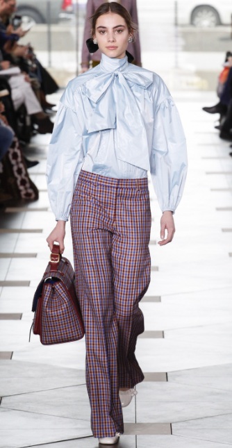 For a more conservative and classic take on the trend, Tory Burch presents the red, blue and white printed flared trouser. The funky plaid pattern contrasts effortlessly with a pale blue pussybow blouse, and also matches with a coordinating leather handbag. Try creating a preppy effect with a velvety black hair bow, paired with gleaming crystal stud earrings.