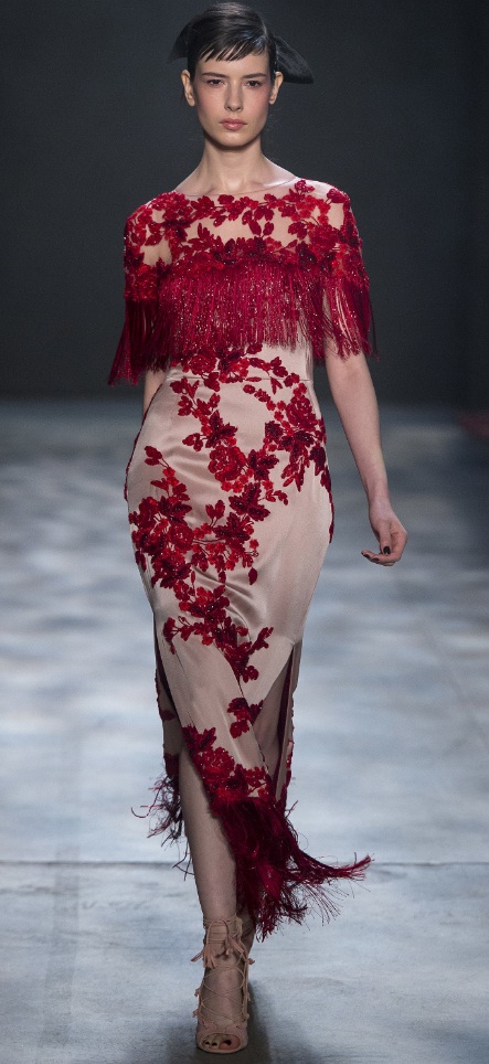 A delicate fringe bodice can easily brighten a sheath dress, and a hearty dose of ruby red colour certainly helps. For a dramatic effect, think illusion neckline, floral embroidery and a delicate slit up the leg. Whether you have a gala on your social calendar or you’re dressed up with nowhere to go, try introducing a fringed bustline into your look.
