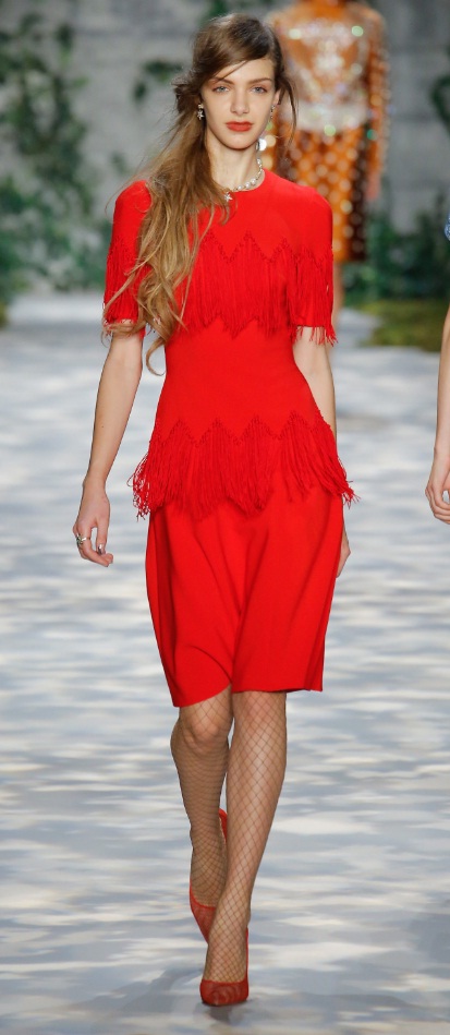 At Jenny Packham, simplicity was the order of the day when it came to sporting fringe. This short-sleeved, poppy red frock makes a grand entrance with its Western style fringe detailing. Slip into a pair of fishnet tights, and then add pearls for a look which combines ladylike charm with vampy vixen style.