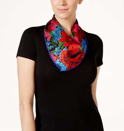 1) Echo Silk Rue Floral Scarf, $51: Try illuminating a little black dress with a colourful, printed scarf. From the party circuit to an after work function, a knotted silk piece is just the accessory that you need. The blue, red and green tones of this floral scarf offer a feminine, cheerful effect.