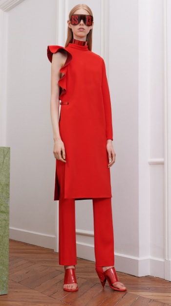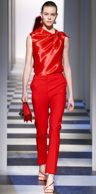 For a glamorous take on the colour choice of the season, look no further than the Oscar De La Renta runway. This ruched sleeveless blouse looks gorgeous when paired with matching skinny trousers and strappy heels. Meanwhile, dangling silver earrings and an embellished red clutch help to pull the entire evening look together.