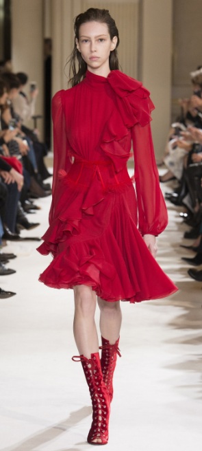 If you’re wondering how to combine ethereal elements with this bright colour, turn to the Giambattista Valli catwalk. We are loving this high-collared vivid red frock, which features ruffles, sheer long sleeves and a flouncy hemline. For a finishing touch, the lace-up red boots offer an edgy, eye-catching aesthetic.