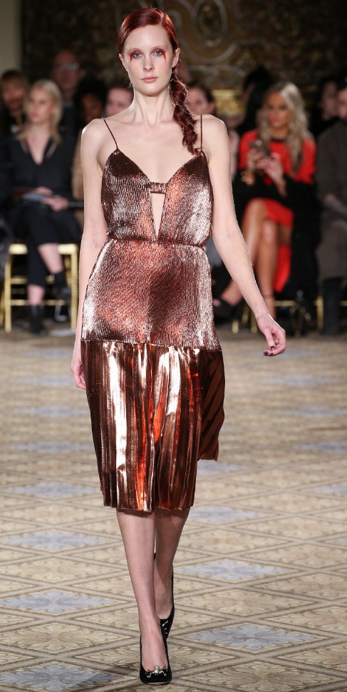 At Ulla Johnson, the metallic dress was decidedly modest and demure. With cap sleeves and a round neckline, this crinkled bronze frock is versatile and can even offer inspiration for your next after hours business function. We are liking the asymmetrical hemline and the textured fabric, which help to create visual interest.