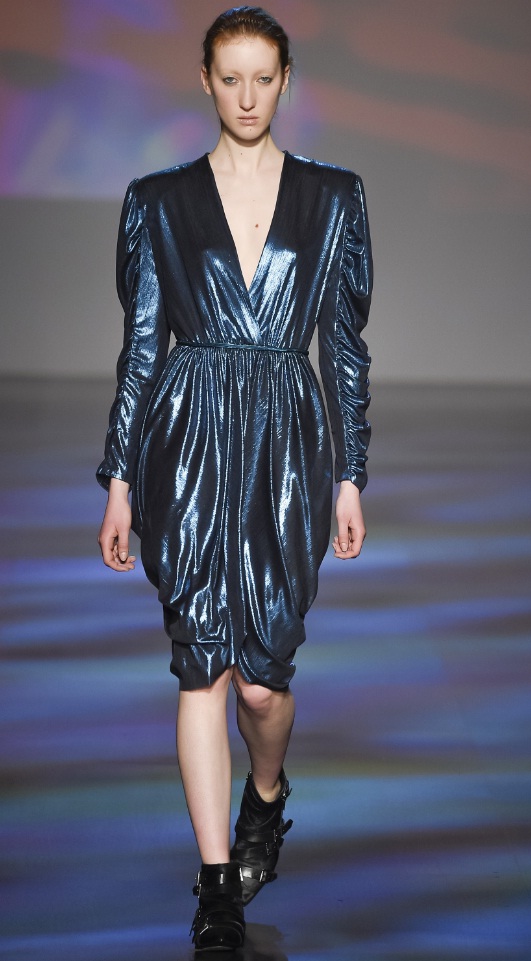 For a hint of colour, draw your inspiration from the Vivienne Tam catwalk. Slip into a ruched dark blue metallic number, accented with a V-neckline and long sleeves. With its shiny sheen and expert draping, this frock has a formal design with a wearable aesthetic at the same time. Meanwhile, the black buckled booties lend a casual, versatile feel to a dramatic dress.