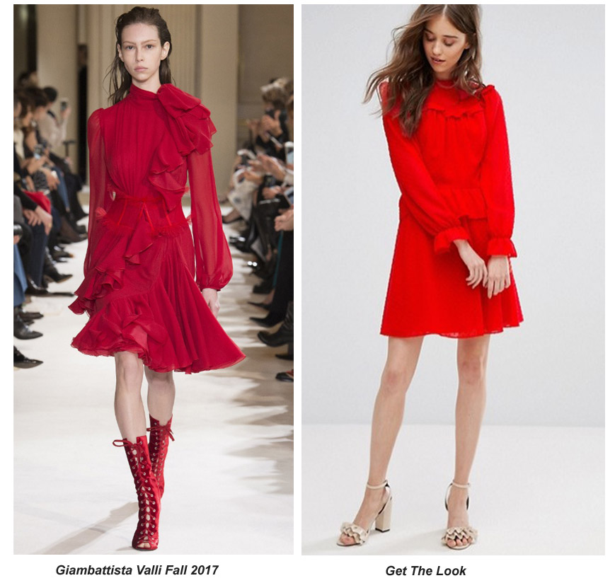 Flamboyant red ruffles were the look of the day at Giambattista Valli, where flounces adorned a sheer long-sleeved frock. With its frilly hemline, this sumptuous dress certainly lights up the runway. If you’re coveting an inspired look on a budget, we suggest this Miss Selfridge Dobby Mesh Ruffle Dress, $42. The vibrant colour, high neckline and delicate sleeves complete the overall aesthetic.