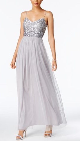 3) Adrianna Papell Sequined Tulle Gown, $260: Try staying true to the celebratory spirit in the air by channelling your inner screen siren in a metallic dress. With its silver sequins, spaghetti straps and long, airy skirt, this gown can easily light up any party that you find yourself at.