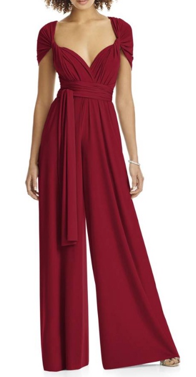 1) Dessy Collection Convertible Wide Leg Jersey Jumpsuit, $197: We are liking the brilliant dark red tone of this jumpsuit, which makes a statement with its flared trousers and silky fabric. Meanwhile, the deep bodice and convertible style allows you to create a seductive style for the evening hours.