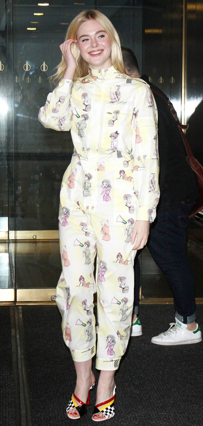 For those who want to rock feminine pastel prints into the beginning of September, turn to Elle Fanning for your inspiration. The 19-year-old actress looks youthful and chic in this pale yellow jumpsuit, which features long sleeves and a high collar. Meanwhile, the whimsical print on her one-piece suit, along with her funky heels, helps to add an edge to a pastel colour palette.