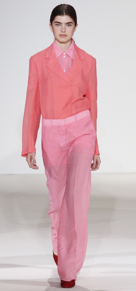 Designer Brandon Maxwell played up drama on the catwalk, and presented a series of voluminous, fairytale gowns. From a textured strapless gown to a cage skirt in blush pink, Maxwell’s eveningwear creations all featured full, floor-length skirts. Plush knit sweaters and belted blazers emphasized the feminine silhouette, while mustard yellow and magenta made an appearance on trousers and a cape dress.