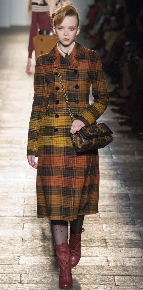 Bottega Veneta turned to mustard tones and shades of orange, which perfectly suited the season of Fall 2017. Rustic autumnal plaid created a sensation in the form of a double-breasted coat, which was paired with polka dot tights. For a finishing touch, a textured chain handbag and burgundy leather ankle boots completed the ensemble.