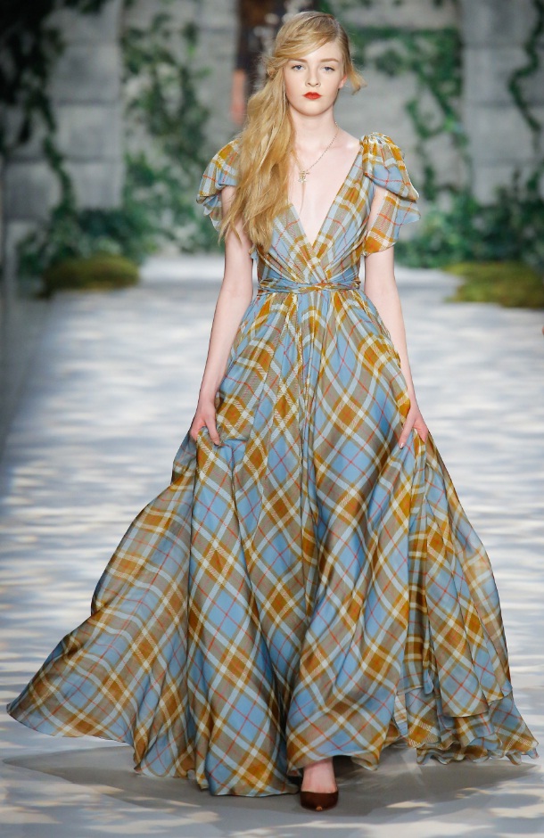 On the runway at Jenny Packham, an ornate, floor-length frock stole the spotlight. Emblazoned with a light blue and yellow plaid print, the short-sleeved evening gown was a beautiful sight. With its voluminous hemline and V-neckline, the dress looked surprisingly sweet and girlish. Meanwhile, the plaid pattern kept the overall design looking low key, versatile and down-to-earth.