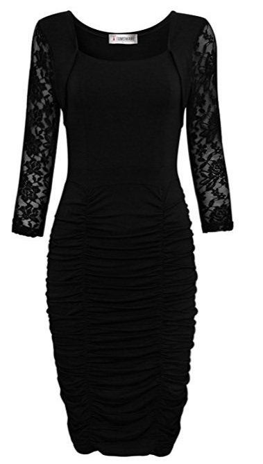 1) Tom’s Ware Bodycon Midi Dress, $38: This cocktail dress features a ruched bodycon silhouette and delicate lace sleeves. With a boat neckline and mid-length hemline, it manages to be demure and classy at the same time.