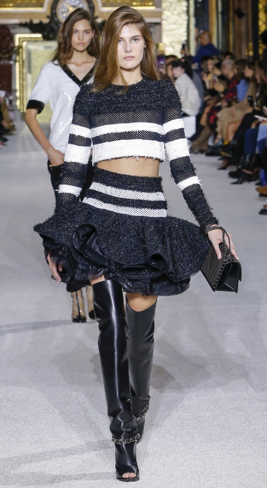 At Balmain, Olivier Rousteing focused on basic black, in the form of sleek black pleather. From shiny overalls to cropped skinny trousers, pleather brought a fierce 1980s style vibe to the runway. Meanwhile, clear plastic was a surprising and edgy twist on traditional fabrics. Models marched the catwalk in see-through boots, trench coats and fitted skirts. With over-the-top black ruffles and peplum waists bringing a finishing touch to designs, the collection managed to be rebellious yet chic.