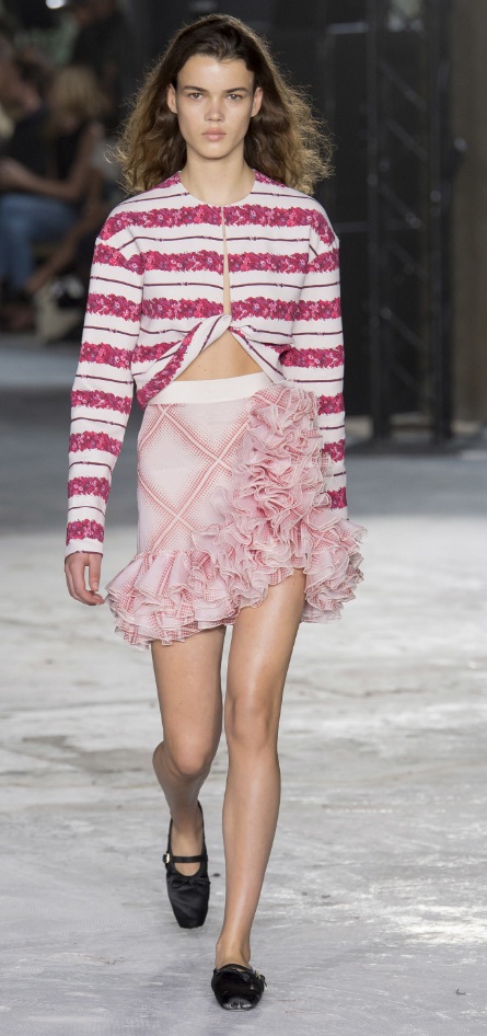 At Giambattista Valli, the theme appeared to be ladylike luxury. The Italian designer featured pink ruffles and lace trim on skirts, tiny sheer camisoles and voluminous tiered frocks. Meanwhile, dainty yellow floral prints made their way onto pantsuits and romantic dresses. For a twist on classic prepster, fitted knit sweater vests were paired with puffed sleeve shirts.