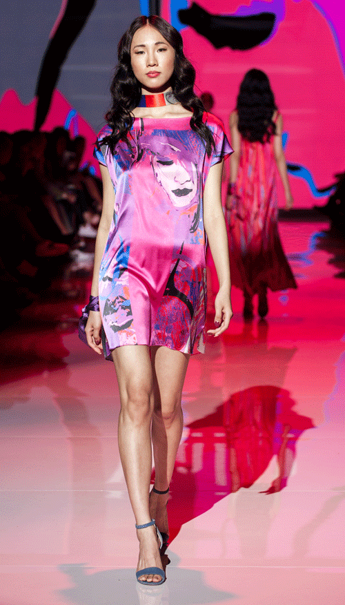 Rock and roll inspiration stole the stage at Hendrixroe, where Toronto designer Jordan Erin McKay channelled her inner child. With a show that opened with strains of Aqua’s 1990s hit Barbie Girl, the Hendrixroe catwalk was a veritable party. Models sported oversized furry jackets in shades of magenta and blush, with pink pantsuits and tweed skirt suits also making an appearance. Glittery shift dresses and neon-hued metallic jackets also added a rebellious feel to a colourful, eclectic collection.