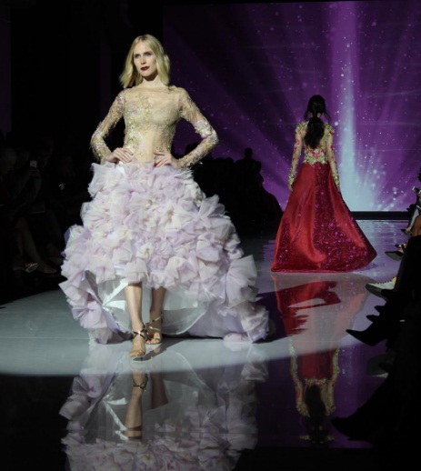 Dubai-based label Amato Couture was founded by designer Furne One (in partnership with textile expert Rashid Ali) in 2002. As the international spotlight at TW, One brought romance and glamour to the Toronto runway. Amato brought the week’s shows to a grand finale, with a presentation of couture ball gowns in candy colours. Princess-like hems, strapless necklines and tiered ruffles offered a fairytale effect, with some sparkling embellishment thrown in for good measure.