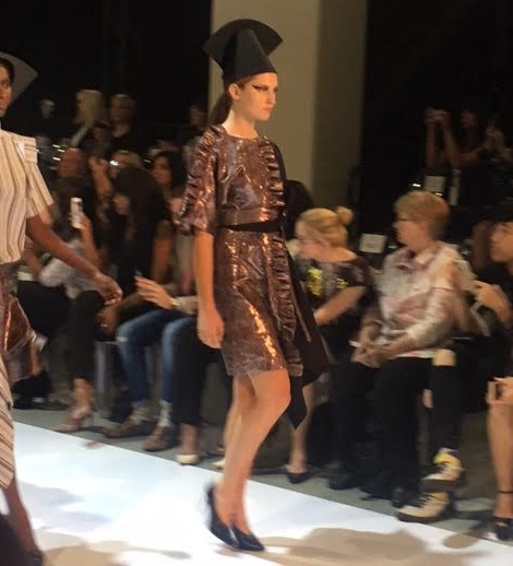 While Zoran Dobric may be based in Toronto, the rising designer has trained at the London College of Fashion and Milan’s Instituto Marangoni. These international influences were evident in Dobric’s latest collection, which was titled United Nations. Dobric sent models down the catwalk wearing architectural, pointed black hats as a statement accessory look. Meanwhile, structured power shoulders and knotted belts brought visual interest to striped and ruched dresses. Shades of brown and ivory were key colours, with metallic surfaces adding a party-ready feel to otherwise conservative frocks.