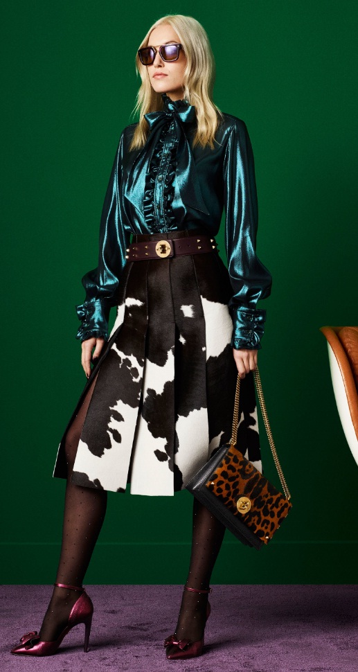 For anyone wondering how to class up their cowgirl style, try drawing your style cues from the runway at Bally. Slip into a silky dark green pussybow blouse and a textured cow print skirt with car wash pleats. Add sheer pantyhose for a finishing touch, along with pointed toe heels and a leopard print handbag. Together, all the unique textures merge together for an upscale Western ensemble.