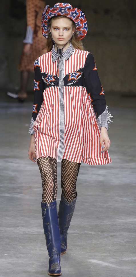At House of Holland, red, white and blue was the look of the day. Try embracing this colour scheme with a vertical striped shirtdress, tiny stars and fringe accents on the sleeves. Add black mesh tights, knee-high blue leather boots and a matching playful hat.