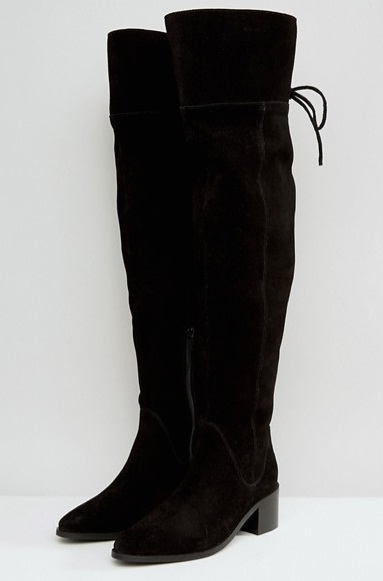 ASOS KOBRA Suede Over The Knee Boots, $133: Whether you’re sporting a little black dress or skinny denim, slipping into a pair of thigh-highs can instantly accentuate your legs. These black suede boots feature low chunky heels, pointed toes and lace-up accents on the back.