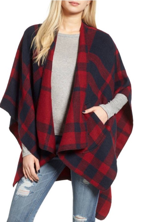 BP. Buffalo Plaid Cape, $61: If the wind is getting to you, try layering a plaid cape over your outfit. With its red and navy tones, this patterned buffalo checkered poncho is certainly suitable for the change in the weather.