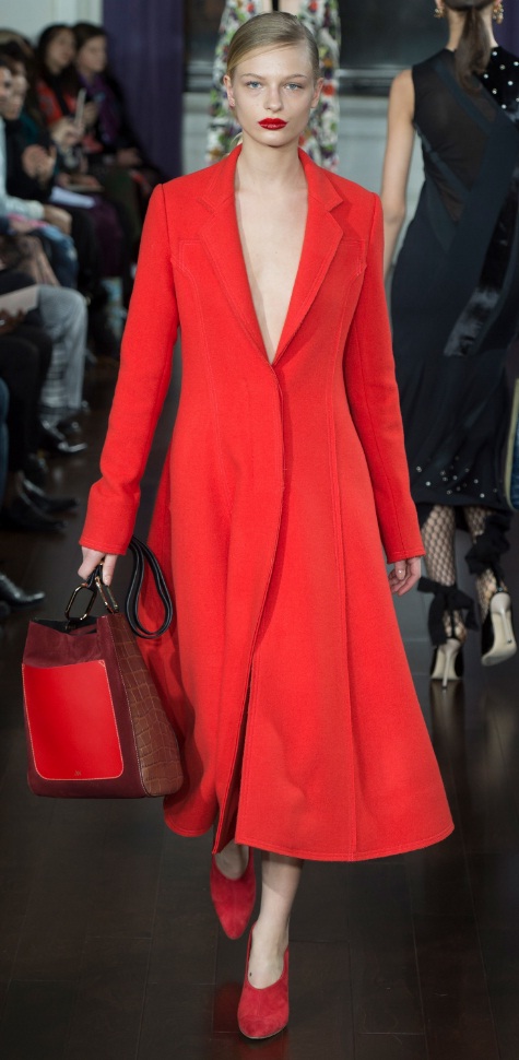 Jason Wu revealed the red frock coat in all its glory, complete with a voluminous flared skirt and a plunging V-neckline. The designer added red suede pumps that complemented the colour of the coat, and a chic handbag. If you’re looking to sport a monochromatic outfit in reddish tones, look no further than this example.