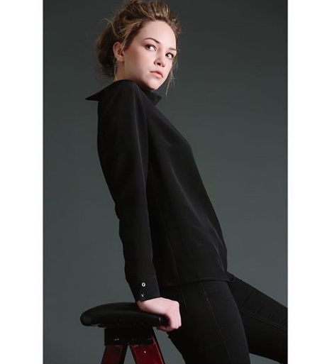 Jessica: The black silk sheer chiffon turtleneck, I love it. It looks amazing with jeans; you can wear it out to dinner. You can wear it with a tank top, or some people will just wear it with a bralette. You can adjust just how high up you wear the turtleneck to go, so I put three buttons on the back. You can go high neck, mid neck or you can wear it open. I love that we put the seam down the centre front, because there is something very alluring.