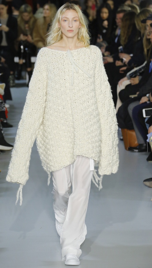 The Joseph catwalk revealed a heavy knit pullover in a snow white shade. Accessorized with sheer white trousers and matching flat sneakers, this outfit of the day looked surprisingly stylish. If you’re wondering how to style your neutral knits with monochromatic pieces, look no further than this particularly chic runway look.