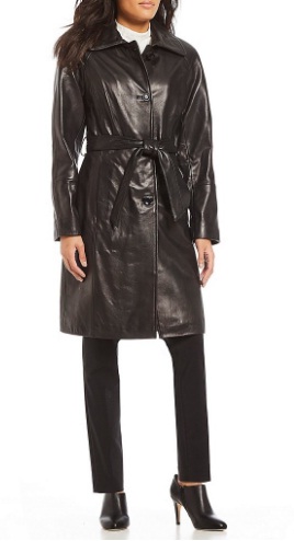 Preston & York Single Breasted Genuine Leather Trench, $300: For a more sophisticated take on the look, try slipping into sleek, shiny leather trench such as this one. This belted coat is wrapped up with a knotted belt for a finishing touch.