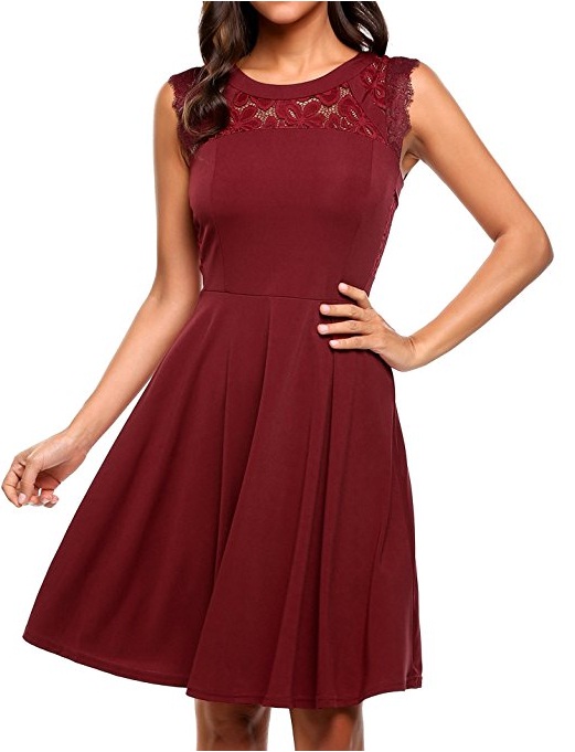 Meaneor Pleated Lace Cocktail Party Dress, $33: With its illusion neckline and floral lace detail, this little burgundy dress just might be a good look for your own date night. The scalloped lace around the sleeveless armholes helps to bring visual interest to an otherwise simple design.