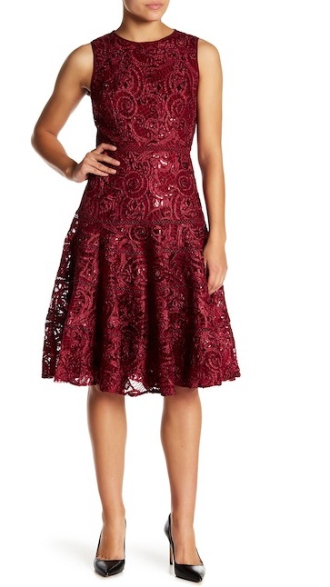 Carmen Marc Valvo Sleeveless Lace Midi Dress, $220: This mid-length frock is embellished with tiny sequins for a subtle bedazzled effect. Meanwhile, heavy fabric, intricate lacy swirls and girlish tiered skirt wrap up the dress.