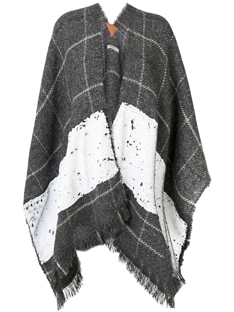 Ermanno Gallamini Checked Cape, $578: As an investment piece, this Ermanno Gallamini piece is a bit of a splurge. However, if you want a more heavy duty design for the Canadian winter, this Italian cape is made with virgin wool. The subtle white print stands out against the light grey colour, with colourblocked white sections for a finishing touch.
